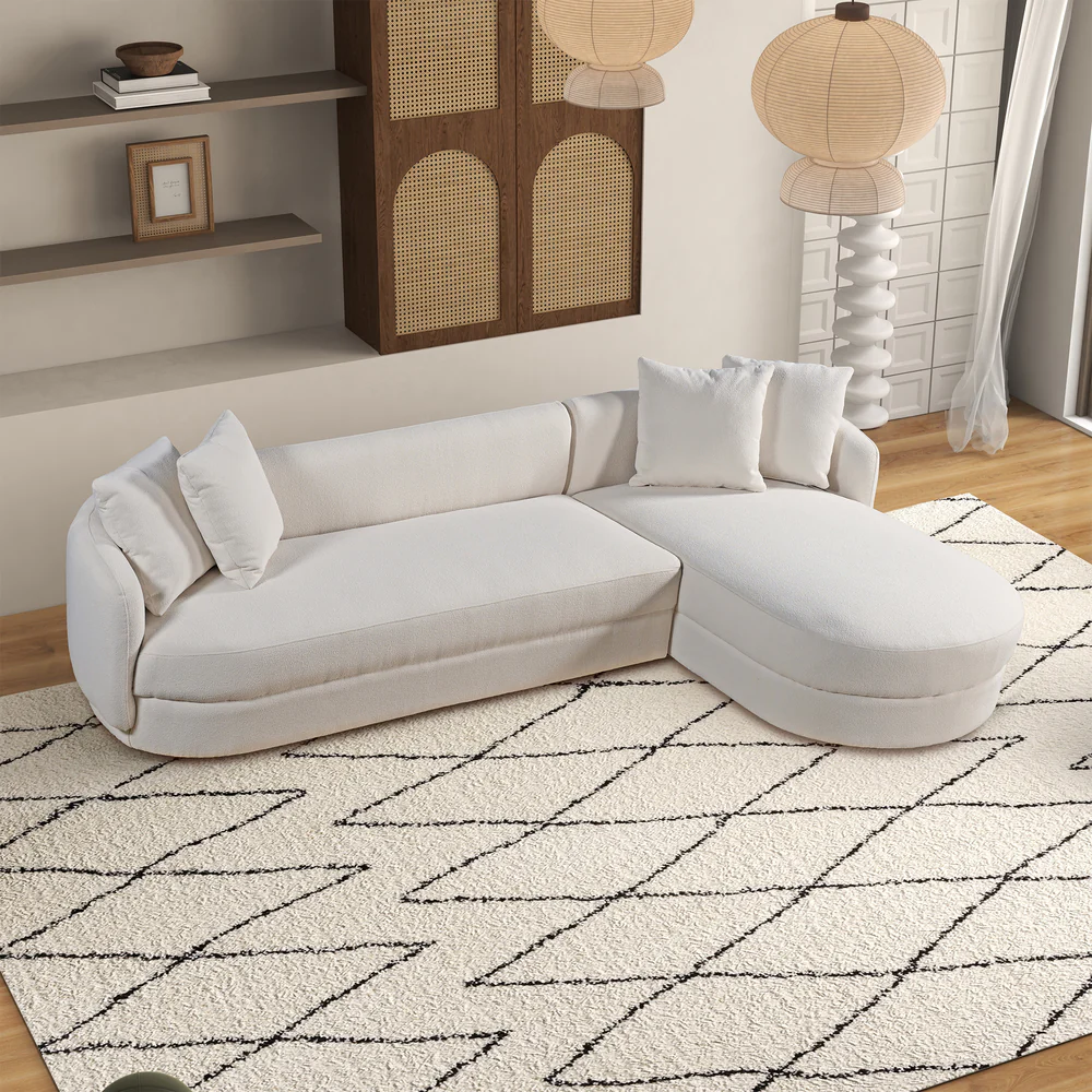 Ce canapé d’angle moderne allie élégance et confort avec son design arrondi et son revêtement en tissu bouclé couleur cognac.